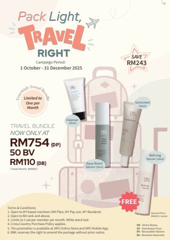 Pack Light, RIGHTPack Light, RIGHTPack Light, RIGHTCleanser (50ml)Aqua BoostSerum (30ml)RefiningSerum (30ml)Sunscreen(30ml)FREE(Total Worth: RM997)TRAVEL BUNDLE NOW ONLY ATRM754 (DP) 50 BVRM110 (DB)fifffflffiCampaign Period: RM2431 October - 31 December 2025Essentials Travel Bundfl%u001a%u0019%u001a%u0018%u0017%u0016%u0015%u0018%u0014 le%u0013%u0012%u0017%u0015%u0011%u0017%u0010%u000f%u0014%u0012%u0018%u000eTerms & Conditions:1. Open to MY based members (MY Plan, MY Pay-out, MY Resident).2. Open to BA rank and above.3. Limits to 1 set per member per month. While stock last.4. Cross Country Purchase Policy applies.5. This promotion is available at (MY) Online Store and (MY) Mobile App. 6. BWL reserves the right to amend the package without prior notice.DB - Direct BonusDP - Distributor PriceBV - Bonusable VolumeBA - Business AssociateNormal Price: RM243 (1 bottle)10