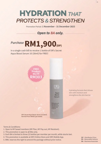 Purchase RM1,900(DP)Open to BA only.in a single cash bill to receive 1 bottle of DR%u2019s Secret Aqua Boost Serum 10 (30ml) for FREE!DP - Distributor PriceBV - Bonusable VolumeBA - Business AssociateTerms & Conditions:1. Open to MY based members (MY Plan, MY Pay-out, MY Resident).2. This promotion is open to all BAs only.3. Each BA is limited to three (3) bottles per member per month, while stocks last.4. This promotion is available at (MY) Online Store and (MY) Mobile App. 5. BWL reserves the right to amend the package without prior notice.FREEProductWorthRM303DR%u2019s Secret Aqua Boost Serum 10 (30ml)Normal Price: RM303 (per bottle)%u201c%u201c fifffflffifl%u001a%u0019%u0018%u0017%u0016%u0015%u0014ffi%u0013%u0012%u0011fl%u0016%u001a%u0010fl%u001a%u0016%u0019%u0018%u0015%u0012%u000f%u000e%u000f%u000f%u0019%u0018%u0016%u000c%u0019%u001a%u0010%u0016%u0013%u0014%u0019%u000f%u001a%u0012ffi%u000e%u0016fl%u0018ffl%u0016%u000f%u001affi%u000e%u0018%u0017%u001a%u0010%u000e%u0018%u000f%u0016%u001a%u0010%u000e%u0016%u000f%u0019%u0018%u0016%u000bflffiffi%u0019%u000effiHYDRATION THATPROTECTS & STRENGTHENHYDRATION THATPROTECTS & STRENGTHENHYDRATION THATPROTECTS & STRENGTHENPromotion Period: 1 November - 31 December 202511