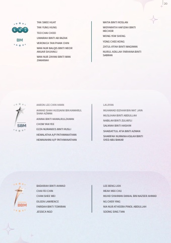 BADARIAH BINTI AHMADCHAI FEI CHINCHAN SHEE WEIEILEEN LAWRENCEFARIDAH BINTI TOMIRANJESSICA NGOLEE BENG LIEKMEAH MEE CHUMUHD SYAHMAN DANIAL BIN NAZEER AHMADNG CHER YINGNIA NUR ATHEERA PINOL ABDULLAHSOONG SING TIANAARON LEE CHIN HANNAHMAD SHAH HUSSAINI BIN KAMARUL SHAH AZMANAININA BINTI KAMALRULZAMANCHOW YAN YEEEZZA NURANEES BINTI RUSLIHEMALATHA A/P PATHMANATHANHEMAVAHINI A/P PATHMANATHANLAIJIYANMUHAMAD IDZHAM BIN MAT JAYAMUSLIHAH BINTI ABDULLAHNABILAH BINTI ZULKIFLISALMIAH BINTI HASHIMSHAIDATTUL ATIA BINTI AZMANSHARIFAH NURAINA ASILAH BINTI SYED ABU BAKARSBMBBMWATIA BINTI ROSLANWIDYARATIH HAFIZAH BINTI MECHORWONG YEW SHENGYONG CHEE KONGZATUL-IFFAH BINTI WAGIMANNURUL ADILLAH FARHANA BINTI SABRANTAN SWEE HUATTAN YUNG HUNGTEO CHAI CHOOUMAIRAH BINTI AB RAZAKVERONICA TAN PHAIK CHINWAN NUR BALQIS BINTI MEOR ANUAR SHUHAILIWAN NUR ZAYANI BINTI WAN ZAKARIAHBM20