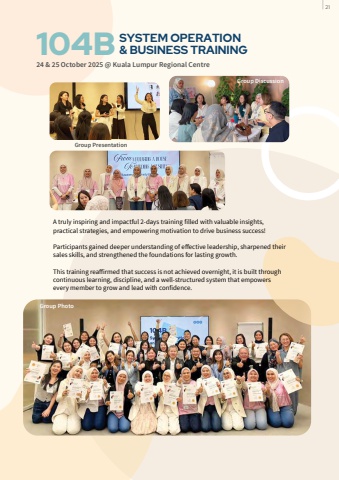 104BSYSTEM OPERATION& BUSINESS TRAINING24 & 25 October 2025 @ Kuala Lumpur Regional CentreA truly inspiring and impactful 2-days training filled with valuable insights, practical strategies, and empowering motivation to drive business success! Participants gained deeper understanding of effective leadership, sharpened their sales skills, and strengthened the foundations for lasting growth. This training reaffirmed that success is not achieved overnight, it is built through continuous learning, discipline, and a well-structured system that empowers every member to grow and lead with confidence. Group PresentationGroup DiscussionGroup Photo21