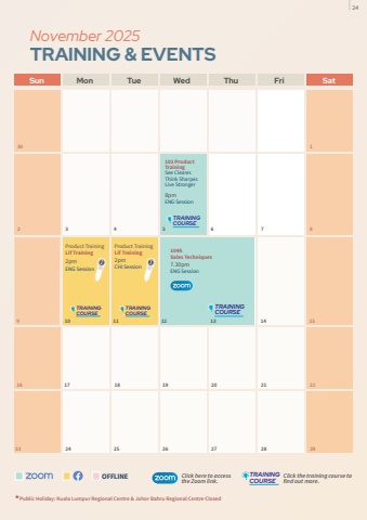 Sun Mon Tue Wed Thu Fri SatNovember 2025 TRAINING & EVENTS TRAININGCOURSE104A Sales Techniques7.30pmENG SessionOFFLINE fifffflffifl%u001a%u0019%u0018%u0017%u0018%u001a%u0016%u0015%u001a%u0014ffiffi%u0018%u0013%u0013%u001a%u0016%u0019%u0018%u001a%u0012%u0015%u0015%u0011%u001affffl%u0010fl%u000ffifffflffifl%u001a%u0016%u0019%u0018%u001a%u0016%u0017%u0014ffl%u0010ffl%u0010%u000e%u001affi%u0015%u0017%u0013%u0018%u001a%u0016%u0015%u001a%u000cffl%u0010%u000b%u001a%u0015%u0016%u001a%u0011%u0015%u0017%u0018%u000fTRAININGCOURSE*Public Holiday: Kuala Lumpur Regional Centre & Johor Bahru Regional Centre Closed18 191516 2212 13 1417 20 212 3 4 5 6 7 8930 123 24 25 26 27 28 29TRAININGCOURSE102 Product TrainingSee Clearer. Think Sharper. Live Stronger8pmENG SessionProduct TrainingLif Training2pmCHI SessionProduct TrainingLif Training2pmENG Session10 11TRAININGCOURSETRAININGCOURSE24