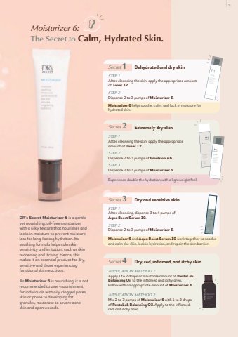 DR%u2019s Secret Moisturizer 6 is a gentle yet nourishing, oil-free moisturizer with a silky texture that nourishes and locks in moisture to prevent moisture loss for long-lasting hydration. Its soothing formula helps calm skin sensitivity and irritation, such as skin reddening and itching. Hence, this makes it an essential product for dry, sensitive and those experiencing functional skin reactions.As Moisturizer 6 is nourishing, it is not recommended to over-nourishment for individuals with oily clogged pores skin or prone to developing fat granules, moderate to severe acne skin and open wounds.Moisturizer 6: The Secret to Calm, Hydrated Skin.Dehydrated and dry skinSTEP 1After cleansing the skin, apply the appropriate amount of Toner T2. STEP 2Dispense 2 to 3 pumps of Moisturizer 6.Moisturizer 6 helps soothe, calm, and lock in moisture for hydrated skin.Secret 1Secret 3 Dry and sensitive skinSTEP 1After cleansing, dispense 3 to 4 pumps of Aqua Boost Serum 10.STEP 2Dispense 2 to 3 pumps of Moisturizer 6.Moisturizer 6 and Aqua Boost Serum 10 work together to soothe and calm the skin, lock in hydration, and repair the skin barrier.Secret 4 Dry, red, inflamed, and itchy skinAPPLICATION METHOD 1Apply 1 to 2 drops or a suitable amount of PentaLab Balancing Oil to the inflamed and itchy area. Follow with an appropriate amount of Moisturizer 6.APPLICATION METHOD 2Mix 2 to 3 pumps of Moisturizer 6 with 1 to 2 drops of PentaLab Balancing Oil. Apply to the inflamed, red, and itchy area.Secret 2 Extremely dry skinSTEP 1After cleansing the skin, apply the appropriate amount of Toner T2. STEP 2Dispense 2 to 3 pumps of Emulsion A6.STEP 3Dispense 2 to 3 pumps of Moisturizer 6.Experience double the hydration with a lightweight feel.5