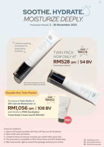 SOOTHE. HYDRATE.MOISTURIZE DEEPLY.RM528 (DP) | 54 BV(Total Worth: RM704)Promotion Period: 1 - 30 November 2025DP - Distributor PriceBV - Bonusable VolumeBA - Business AssociateTerms & Conditions:1. Open to MY based members (MY Plan, MY Pay-out, MY Resident).2. Open to BA rank and above.3. Limited to three (3) sets per member per month while stock last.4. This promotion is available at (MY) Online Store and (MY) Mobile App. 5. BWL reserves the right to amend the package without prior notice.DR%u2019s Secret Moisturizer 6 (30 ml)Normal Price: RM352 (per bottle)%u201c%u201cIntensive soothing moisturiser for long-lasting hydration TWIN PACKNOW ONLY AT SOOTHE. HYDRATE.MOISTURIZE DEEPLY.fifffflffiRM176fifffflffiRM352 Purchase 2 Twin Packs of DR%u2019s Secret Moisturizer at and receive a FREE Eucalyptus Forest Body Cream (worth RM149)!RM1,056 (DP) | 108 BVDouble the Twin Packs!FREE6