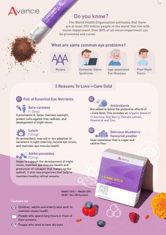 Do you know?The World Health Organisation estimates that there are at least 253 million people in the world that live with vision impairment. Over 80% of all vision impairment can be prevented and cured. What are some common eye problems?Myopia Computer VisionSyndromeAge-associated Eye DiseasesPoor NightVision Full of Essential Eye Nutrients Beta-carotene (1.2mg)A provitamin A, helps maintain eyesight, protect cells against free radicals, and development of night vision. Lutein (12mg)An antioxidant, may aid in eye adaption to variations in light intensity, relieve eye strain, and maintain eye macula health. Anthocyanosides (12mg)Helps to support the development of night vision, maintain eye macula health and production of collagen that makes up the eyeball. It also has properties that help to maintain healthy retinal vessels. 3 Reasons To Love i-Care Gold AntioxidantsAre added to boost the protective effects of i-Care Gold. This includes an organic blend of 11 berries, Goji Berry, Tomato extract, Vitamin A and Zinc. Delicious blueberry- flavoured powderUses sweetener that is sugar and calorie-free.RM367 (SP) | RM292 (DP) 40 BV / Box (30 Sachets)Children, adults and elderly who wish to maintain vision healthPeople who spend long hours in front of their screensPeople who tend to have dry eyesSuitable for7