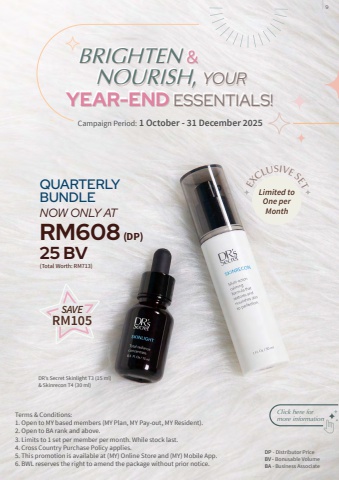 BRIGHTEN & NOURISH, YOURYEAR-END ESSENTIALS! BRIGHTEN & NOURISH, YOURYEAR-END ESSENTIALS!(Total Worth: RM713)QUARTERLY BUNDLE NOW ONLY ATRM608 (DP) 25 BV DR%u2019s Secret Skinlight T3 (15 ml)& Skinrecon T4 (30 ml)Terms & Conditions:1. Open to MY based members (MY Plan, MY Pay-out, MY Resident).2. Open to BA rank and above.3. Limits to 1 set per member per month. While stock last.4. Cross Country Purchase Policy applies.5. This promotion is available at (MY) Online Store and (MY) Mobile App. 6. BWL reserves the right to amend the package without prior notice.DP - Distributor PriceBV - Bonusable VolumeBA - Business AssociatefifffflffiRM105 BRIGHTEN & NOURISH, YOURYEAR-END ESSENTIALS!Campaign Period: 1 October - 31 December 2025EXCLUSIVE SETfl%u001a%u0019%u001a%u0018%u0017%u0016%u0015%u0018%u0014%u0013%u0012%u0017%u0015%u0011%u0017%u0010%u000f%u0014%u0012%u0018%u000eClick here for more information9